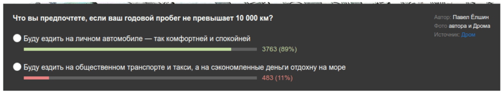 Как ни крути, а в России автомобиль — это лишь отчасти средство передвижения. Автор, на пальцах посчитавший невыгодность автомобиля для городского жителя в конце дал опросник на тему, что пользователи выберут — экономить или продолжать терять деньги, но ездить на личном авто. Вот результат: