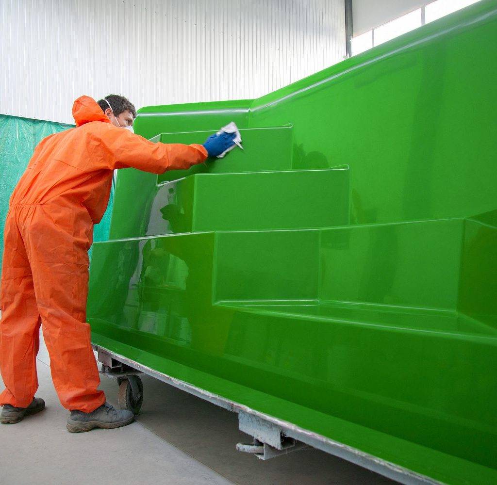 После изготовления бассейна определенной формы из стекловолокна внутри готового изделия наносится гелькоут. Это покрытие сначала представляет собой гель, а затем затвердевает в результате полимеризации, которая представляет собой химическую реакцию, укрепляющую его. Гелькоут делает бассейн из стекловолокна очень гладким, устойчивым к появлению водорослей, достаточно прочным и не требующим особого ухода.