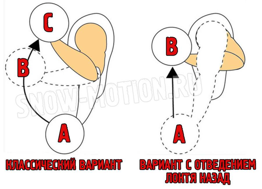 - Первый (классический вариант): сложнее с точки зрения подъёма, т.к. большая нагрузка создаётся дополнительно в точке «В». Такой вариант позволит взять меньший вес, но время нахождения мышцы под нагрузкой больше при прочих равных.