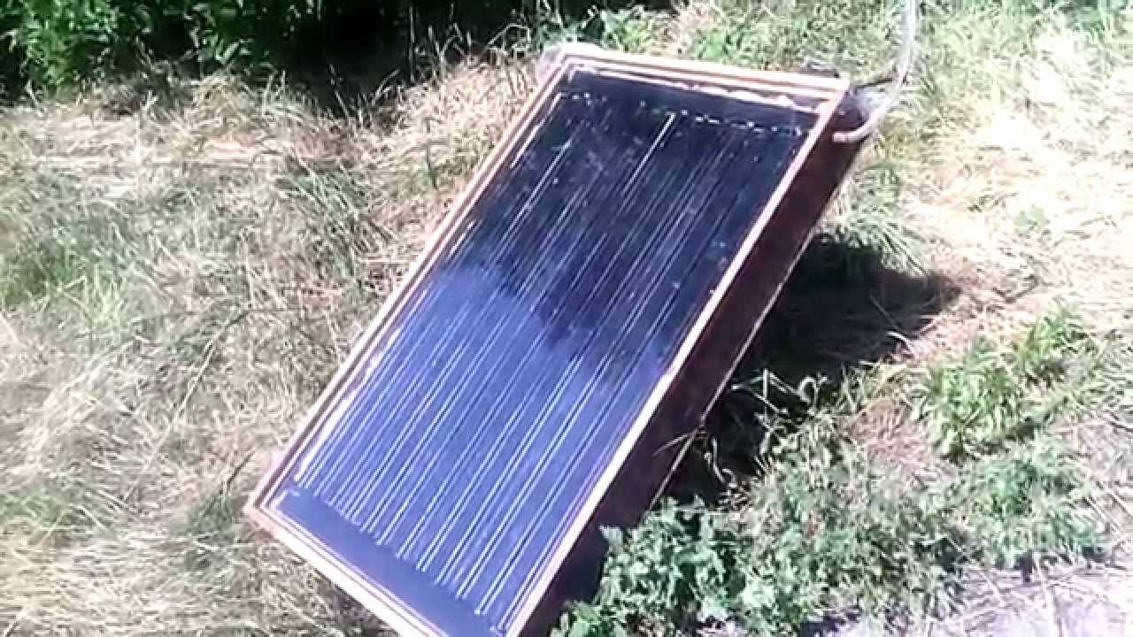 На полотне размечаются линии, где будут проходить трубы. Расстояние между ними около 50 мм. По краям фанеры крепятся держатели под трубы. Полипропилен нарезается таким образом, чтобы длина одной трубы была короче на 15 см самого полотна. Две трубы наоборот должны быть длиннее всех остальных на 30 см. Это будут соединения на входе и выходе солнечного коллектора. Все трубы соединяются между собой при помощи угловых фитингов и элементов, подходящих для полипропилена или металлопластика. Таким образом, собирается конструкция змеевика. Змеевик окрашивается в черный цвет, при помощи аэрозольного баллончика. На трубах входа и выхода воды устанавливают тройники. Подсоединяют шланги, насос и монтируют обратный клапан. Для проверки закачивают воду и проводят гидравлическое испытание.