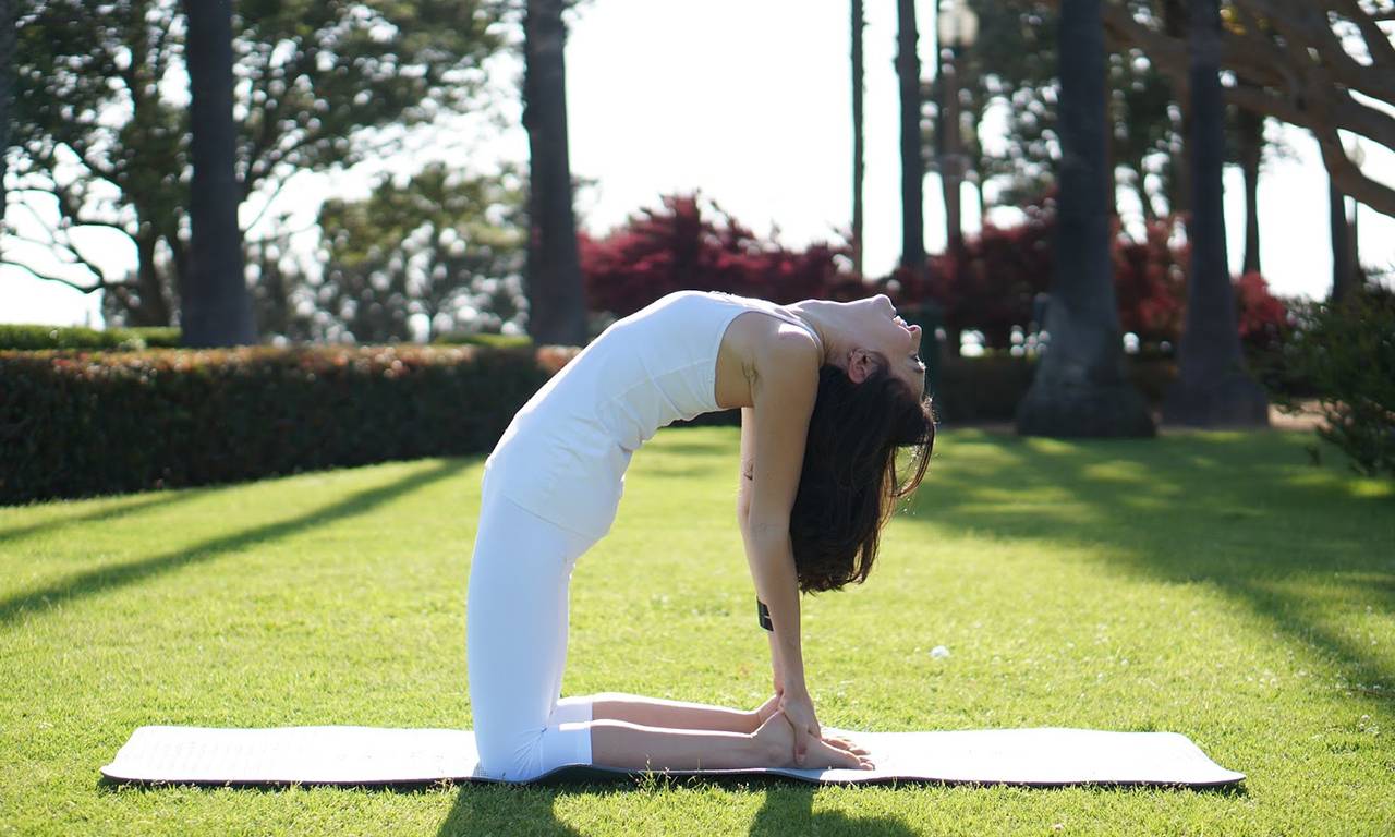 - добавьте в позу динамики: продолжая вытягиваться назад, опустите корпус так, чтобы макушка коснулась пола, а затем вернитесь в исходное положение.