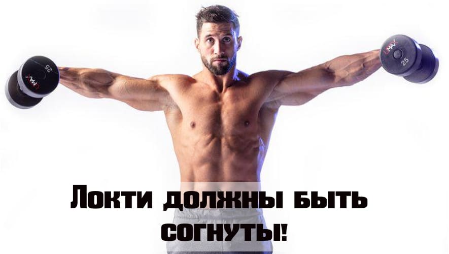 Наша главная задача добиться хорошей траектории хода гантелей. Движение будет происходить как бы по дугообразному маршруту, при этом локти не должны выходить вперед и назад. Это исключит смещение нагружаемой области, а также максимально задействует средний пучок.