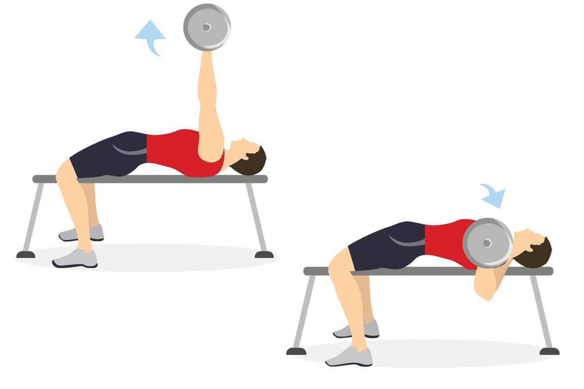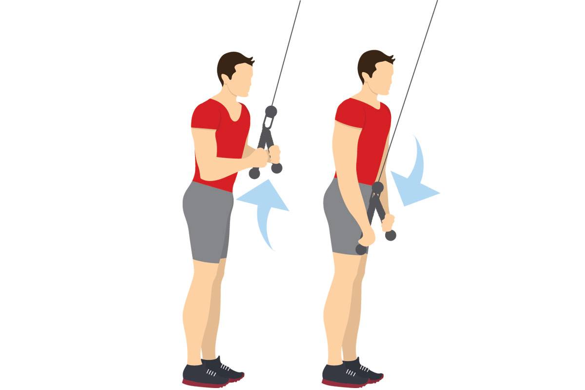 Упражнение для развития трицепса — ключевой мышцы рук (фактически, трицепс в два раза больше бицепса). Используйте средний вес и не раскачивайтесь при опускании веса вниз. Начинающим рекомендуется прижимать локти к корпусу, чтобы изолировать работу мышц рук.