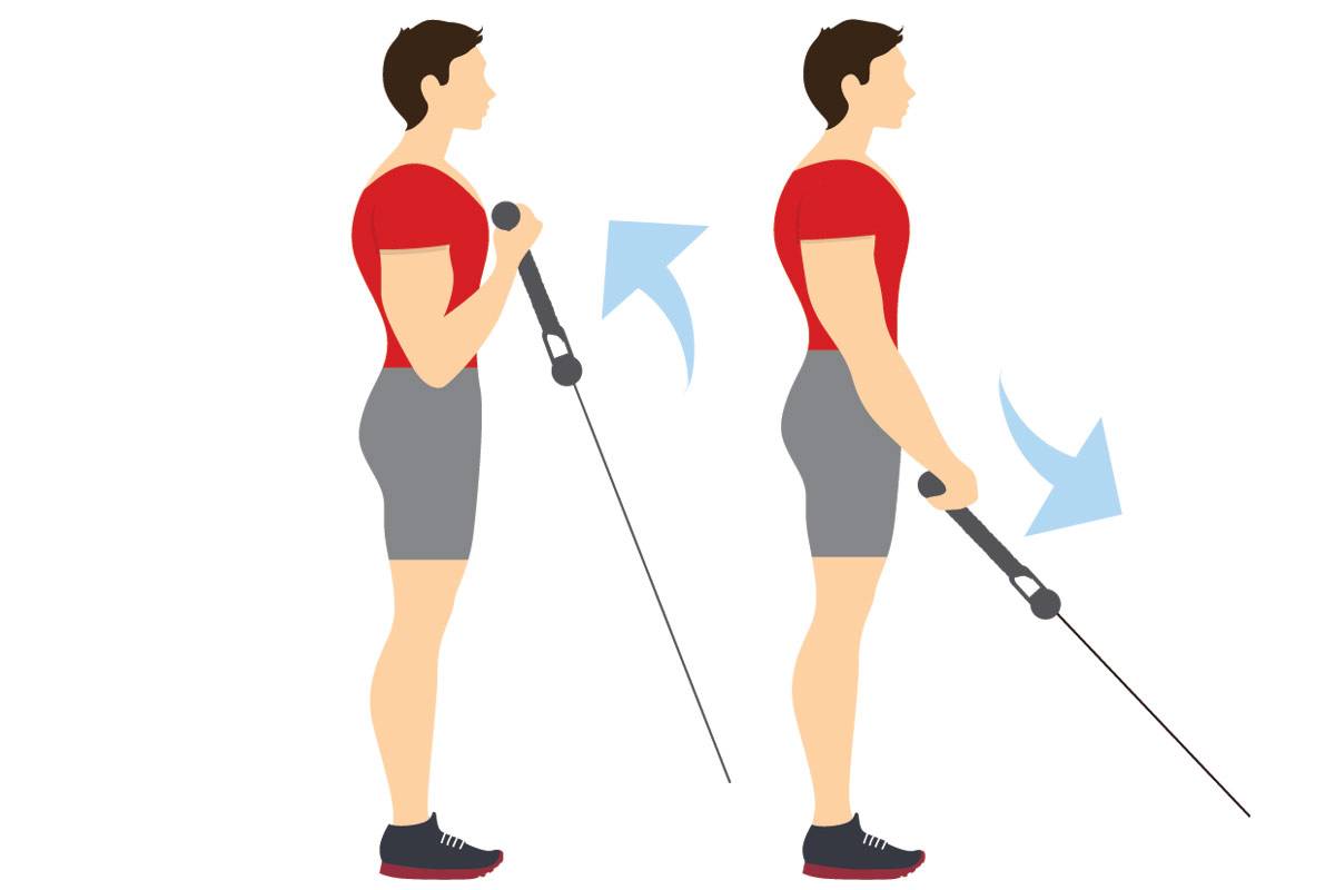 Упражнение для проработки мускулатуры бицепса. При подъеме веса вверх также необходимо сохранять неподвижное положение туловища, а локти — плотно прижатыми к корпусу. Может быть заменено на аналогичное упражнение с гантелями и штангой, а также на упражнения в тренажерах.