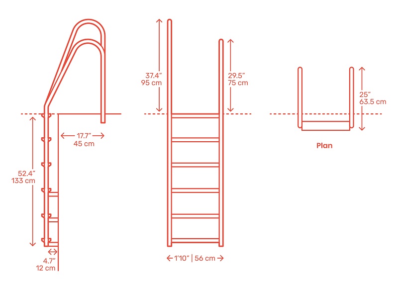 План и вертикальные чертежи стандартной лестницы для бассейна с размерами по высоте, ширине и глубине