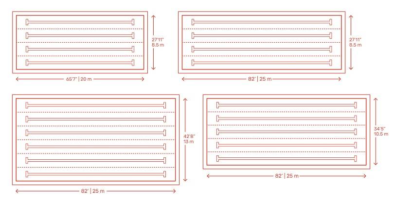 Чертежи плана с размерами различных размеров для общественных бассейнов с несколькими типами дорожек