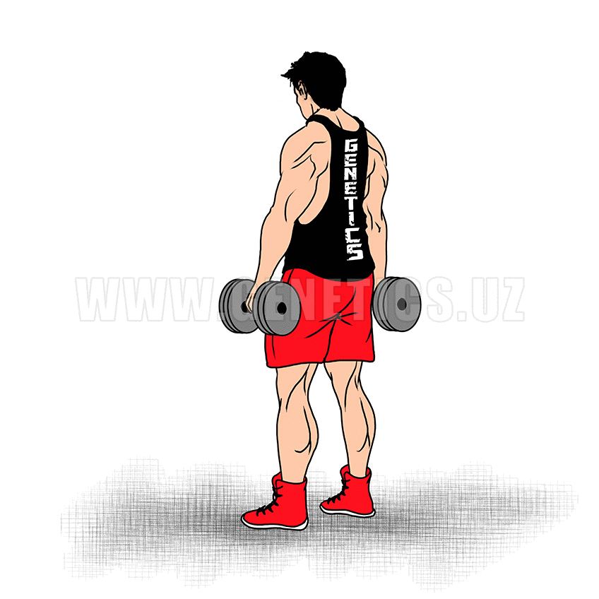 - Встаньте прямо, возьмите в руки тяжёлые гантели (можете использовать кистевые ремни). Немного подайте их вперёд, а плечи назад. Гантели спокойно свисают по бокам на выпрямленных руках.