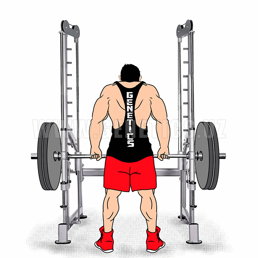 Для удобства это упражнение рекомендуется выполнять в тренажере Смита. В нижней точке немного расслабьте все мышцы плечевого пояса, чтобы опустить штангу как можно ниже. Но не забывайте держать при этом поясничный отдел позвоночника идеально ровно. Чем ближе к спине вы будете вести штангу при подъеме, тем сильнее будут работать трапеции. Более удаленное положение будет сильнее нагружать задние дельты.