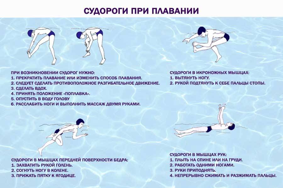 Когда в неглубоком бассейне сводит ногу, что делать: при появлении неприятных ощущений, нужно опереться ступнями о дно. Это поможет избежать усиления мышечных спазмов.