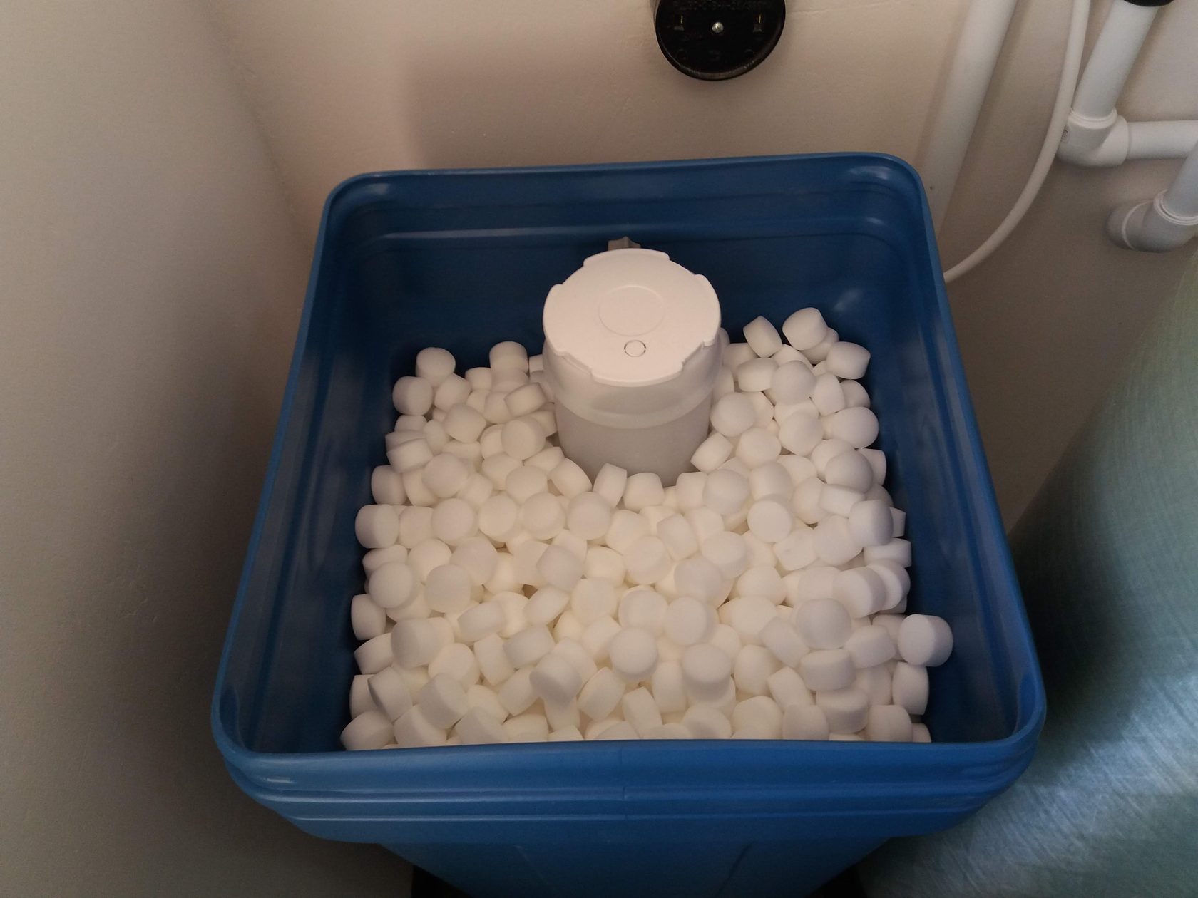 Механизм солевого бака находится в пластиковой шахте, отделяющей механизм от таблетированной соли.