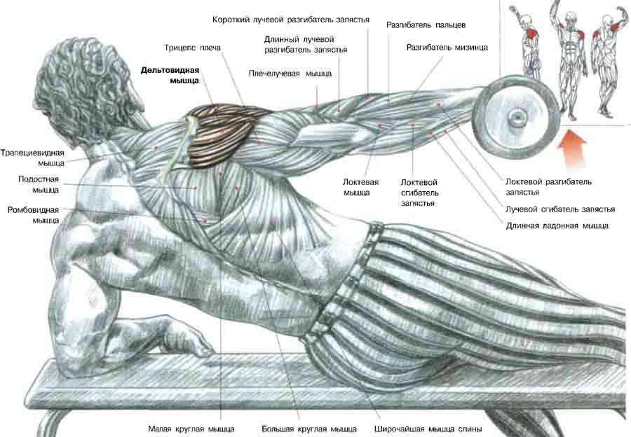 Это упражнение мужчина и женщина могут выполнять стоя, лежа на скамье и из положения сидя. Вовлекает в работу в основном только задние пучки дельтовидных мышц, а также среднюю и нижнюю части трапециевидной мышцы, ромбовидную мышцу, большую круглую и надостную мышцы.