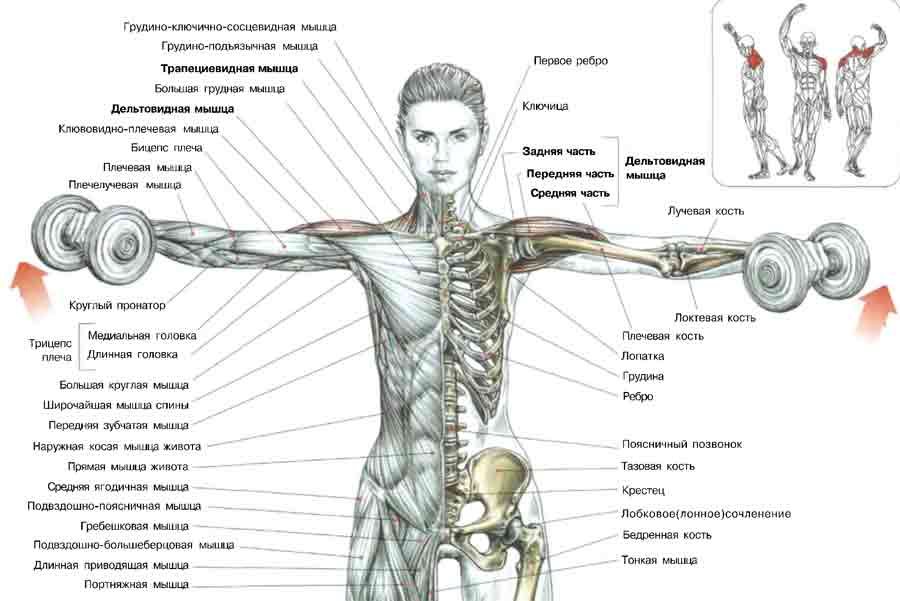 В этом упражнении главным образом задействуется средний пучок дельтовидной мышцы, но в целом в работу включены все пучки, верхний участок трапециевидной мышцы и надостная мышца.