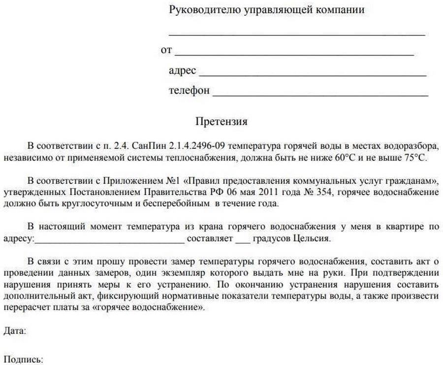 - Обращение в управляющую компанию. Необходимо составить общую жалобу, в которой потребуется отразить существующую проблему. Чем большее количество жильцом подпишется в данной жалобе, тем выше вероятность соответствующей реакции со стороны УК. К жалобе потребуется прикрепить документальное свидетельство с результатами экспертизы, проведенной независимой компанией. Экспертиза должна подтверждать, что зафиксированный уровень температуры воды и её качестве неприемлем для дальнейшего применения.
