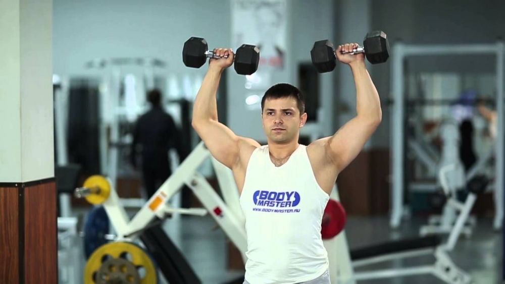 - Жим гантелей над головой – 3 подхода по 12 повторов.