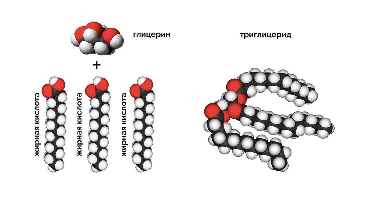 Строение молекулы жира: глицерин и три остатка жирных кислот