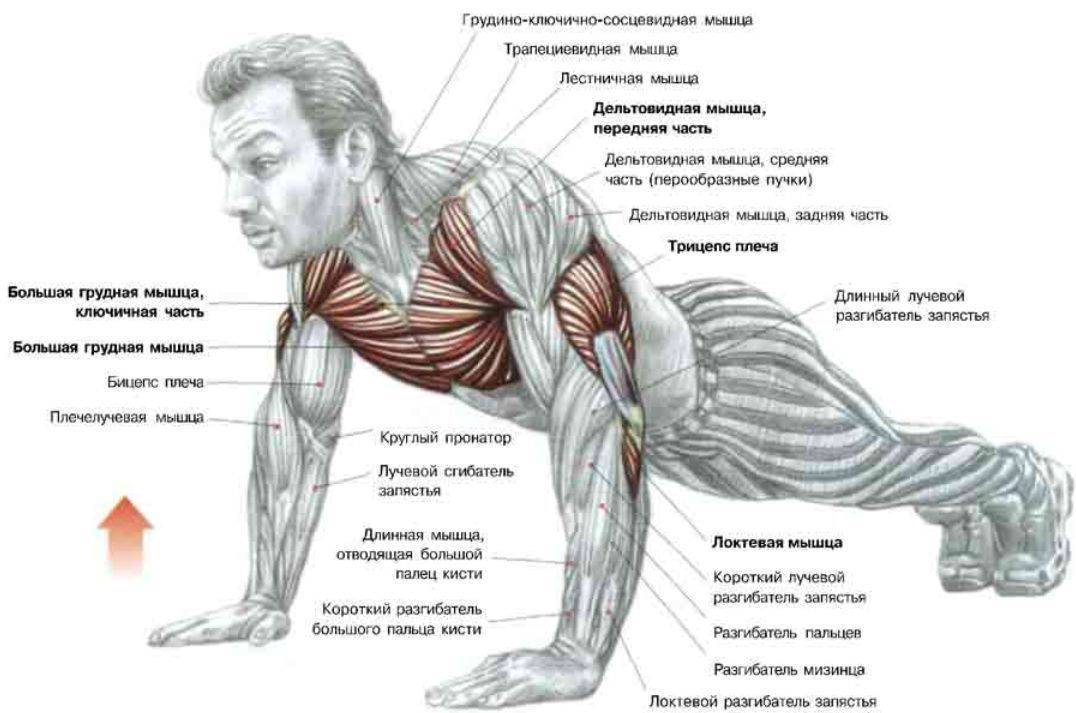 В различных типах отжиманий работают разные мышцы. Выше приведен график, показывающий, какие группы мышц работают в наибольшей степени.