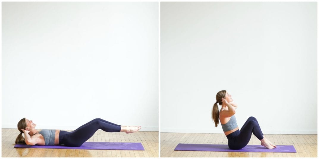 Модификация: По желанию можно удерживать пятки на полу все время, а не держать их на весу, но тогда придется садиться полностью. Или можно просто выполнить скручивание наполовину.