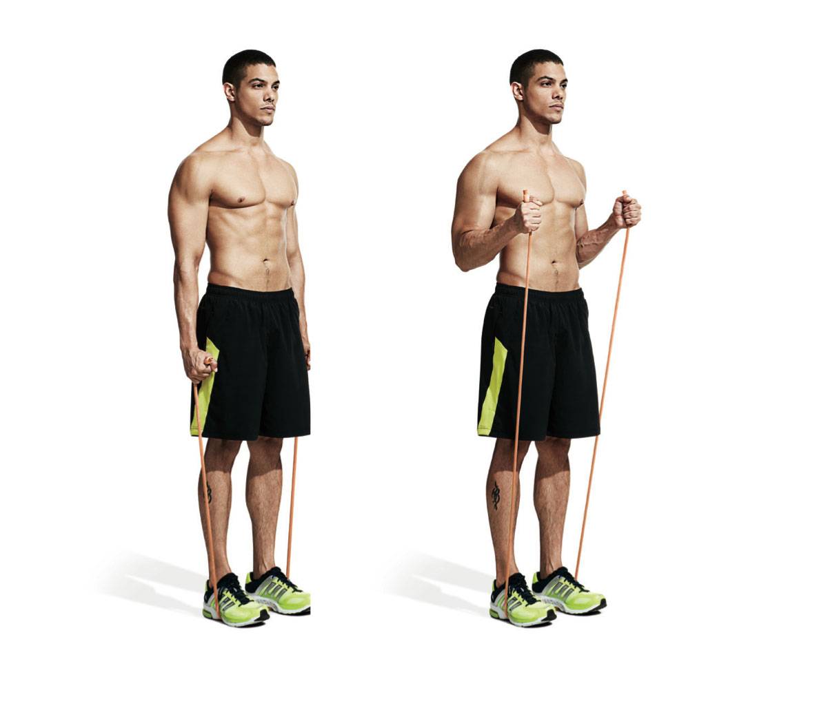 Данное упражнение лучше всего выполнять либо с разомкнутой резиновой лентой, либо с резинкой со специальными рукоятками. Зажмите нижний край ногами, после чего сгибайте руки в локтях за счет силы бицепса. Следите за тем, чтобы локти не изменяли положения и не уходили вперед (либо прижимайте их к поясу).