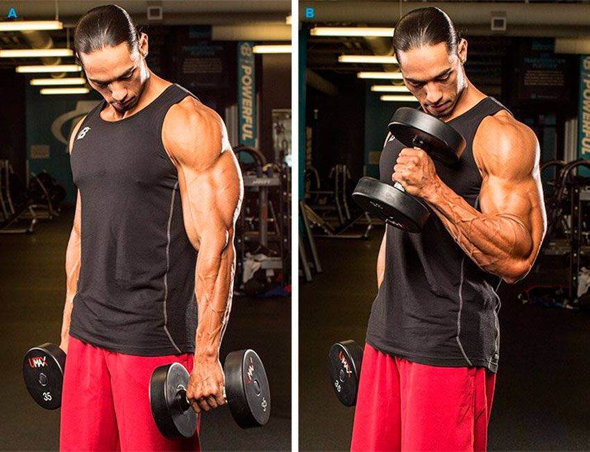 Сгибание рук с гантелями хватом «молоток» занимает работой: