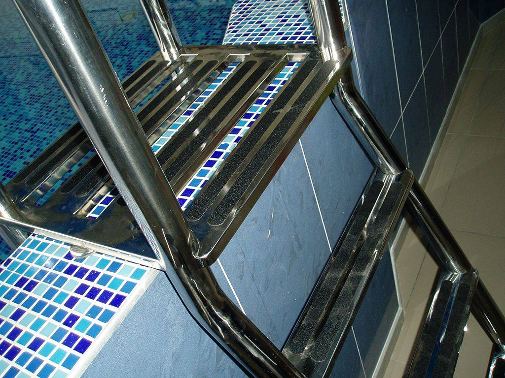 Наличие поручней. Лестницы для бассейна с поручнями обеспечивают безопасность, удобство выхода и погружения в воду. Поручни, как и ступени должны быть с антискользящими вставками;