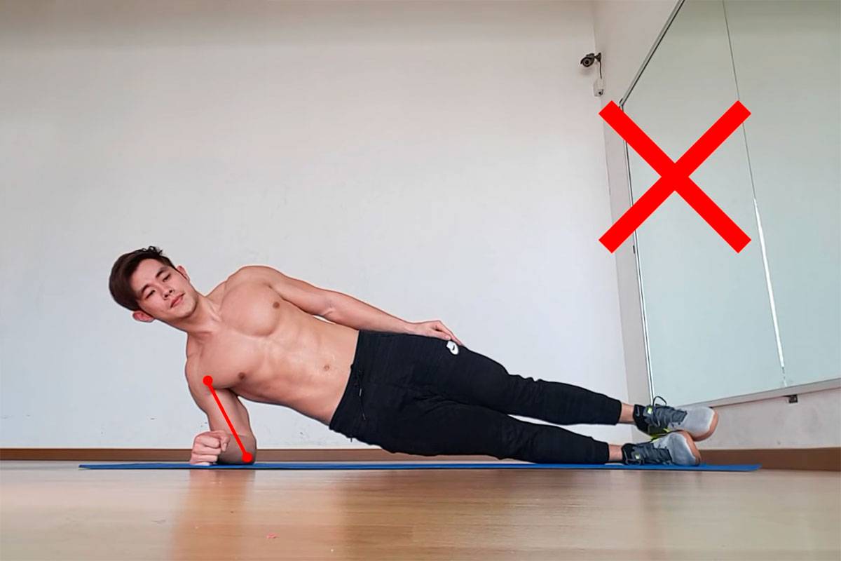 Как и в случае с обычной планкой, локоть должен располагаться ровно под плечевым суставом.