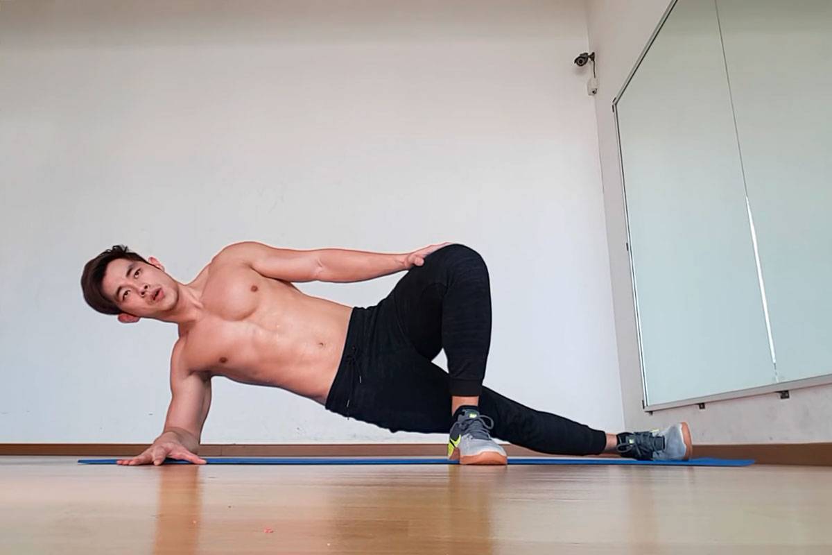 И.П. Лечь на бок, затем опираясь на локоть поднять туловище и развести ноги либо положить друг на друга.