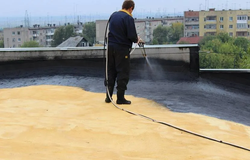Используя технологию напыления, жидкую гидроизоляцию устраивают на плоских или, наоборот, значительно наклонённых крышах. При орошении состав распределяется на поверхности идеально равномерно.