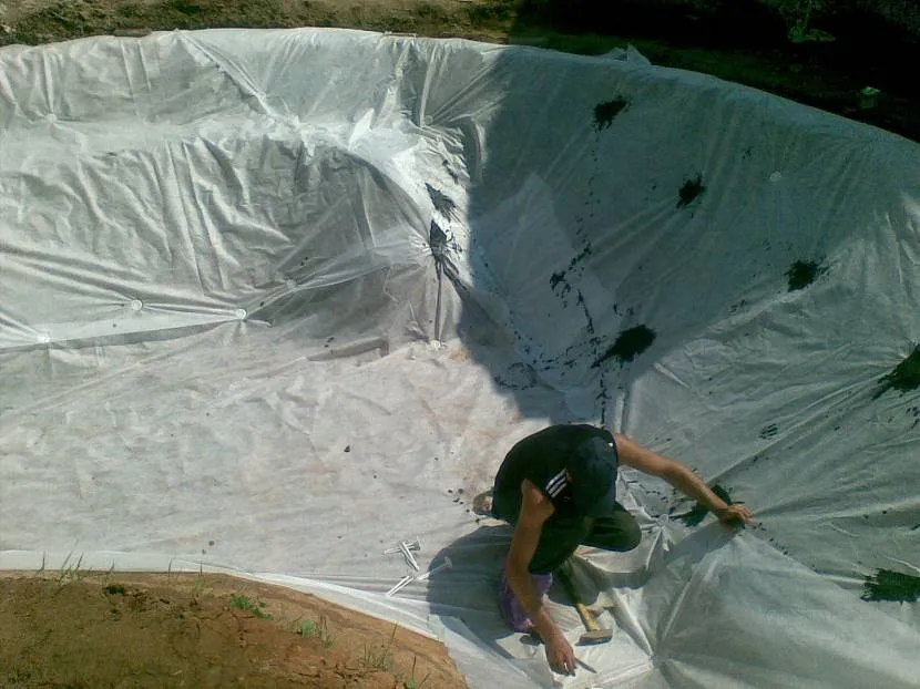 Слой гидроизоляции может наноситься как на бетон, так и на почву. Во втором варианте дно накрывается плотным слоем геотекстиля, швы между которым должны быть закреплены металлическими скобами. Последующий порядок работ выглядит следующим образом: