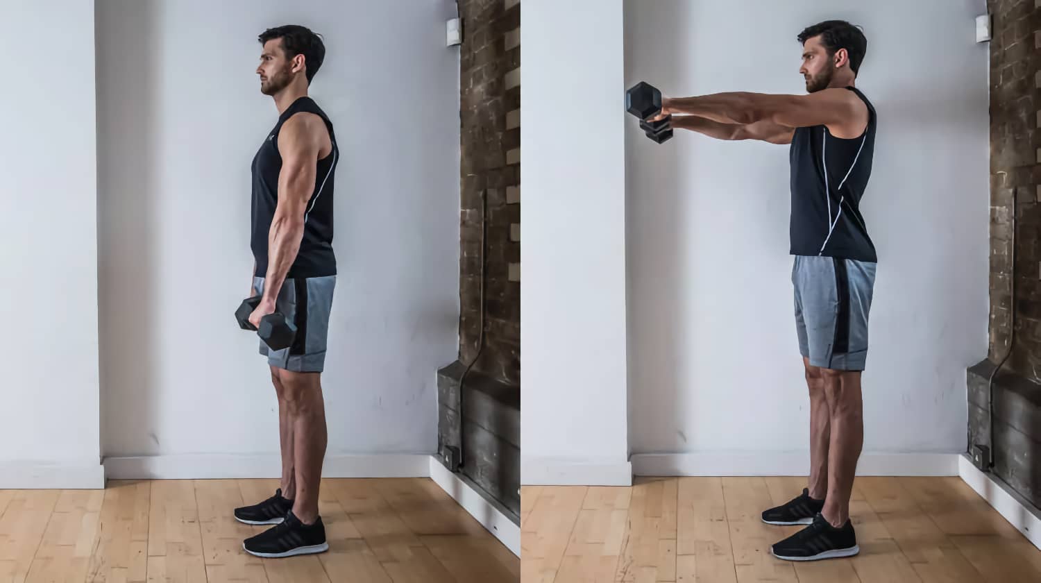 Уделите внимание передним дельтам. Расположите гантели перед собой, медленно поднимите их и остановитесь чуть ниже уровня глаз