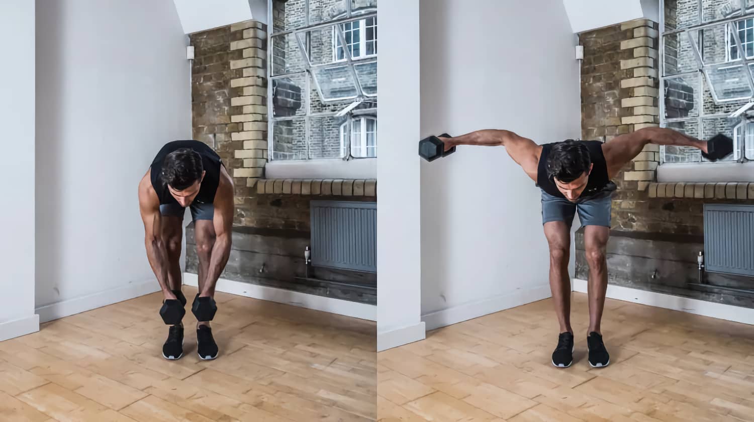 Слегка согнув руки в локтях, наклонитесь вперед — спину держите, пожалуйста, прямо — и поднимите гантели так, как будто вы машете крыльями. Вернитесь в исходное положение.
