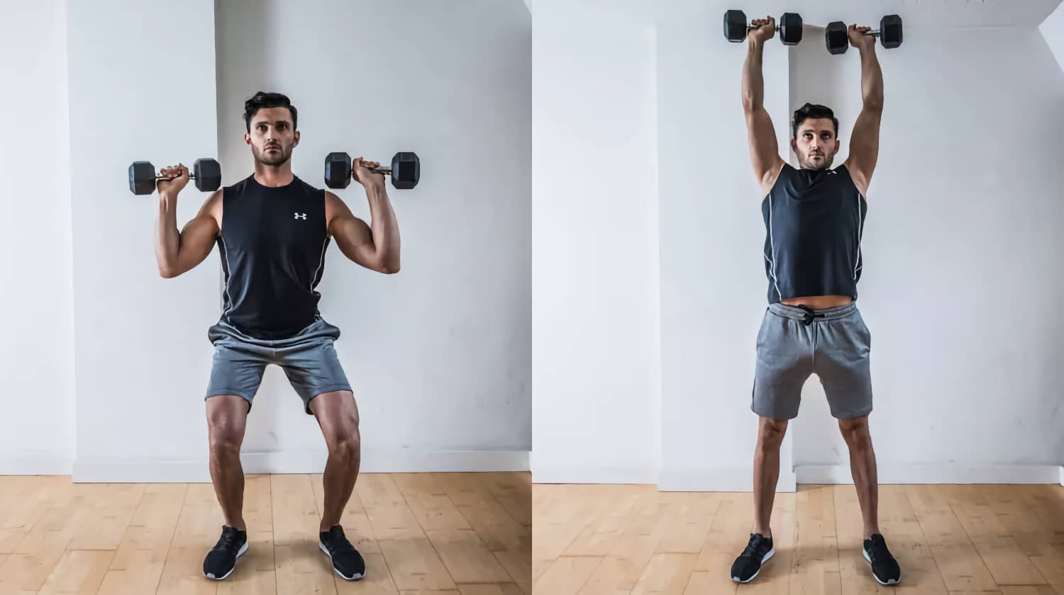 Гантели должны быть чуть отодвинуты за плечи, после чего вы опускаетесь в четверть приседа. Оттолкнитесь пятками и выбросьте гантели над головой, затем сосредоточенно опустите их. «Удержание» — самая сложная часть, поэтому рассчитывайте тяжесть веса и используйте тот, с которым сможете работать. Во время удержания напрягите пресс и ягодицы, чтобы нижняя часть спины была выровнена.