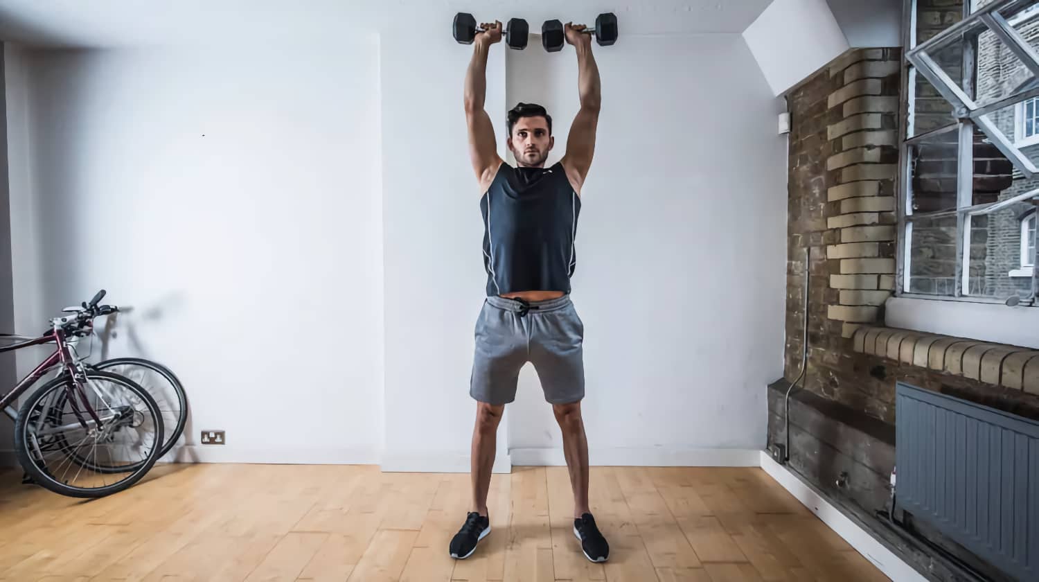 Делайте 10-15 повторений в течение 30 секунд, а затем удерживайте гантели над головой в течение 30 секунд.