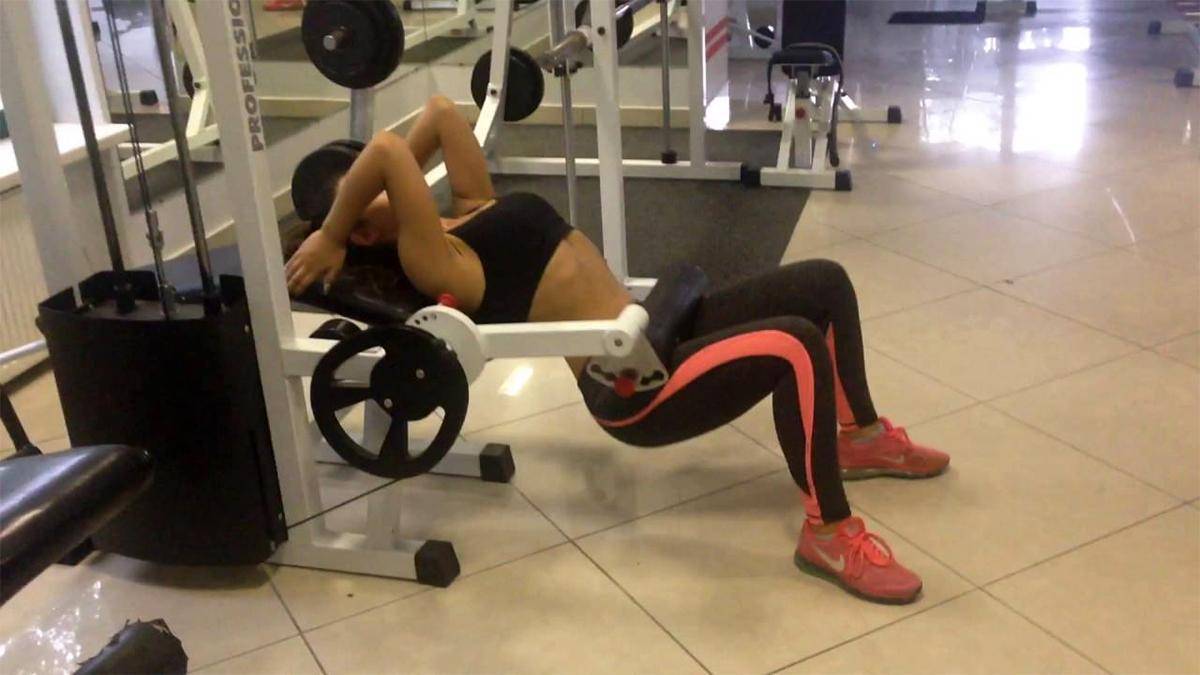Ягодичный мостик в тренажере для сгибания ног. Плюс в том, что валик в отличие от штанги мягкий и не давит на бедра. Но качество при этом заметно страдает. Как по мне, так очень сильно. Мне так и не удалось почувствовать хорошей работы ягодиц.