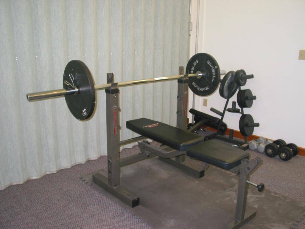 - Устанавливается гриф на стойки или на ограничители силовой рамы с необходимым весом.
